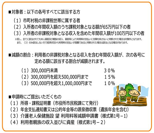 この事業は、市町村が行う高額介護サービス費及び特定入所者介護サービス費などの減額サービスとは別に当施設が定める基準により利用料が減額される制度で、市町村の減額サービスと併用して適用される制度です。